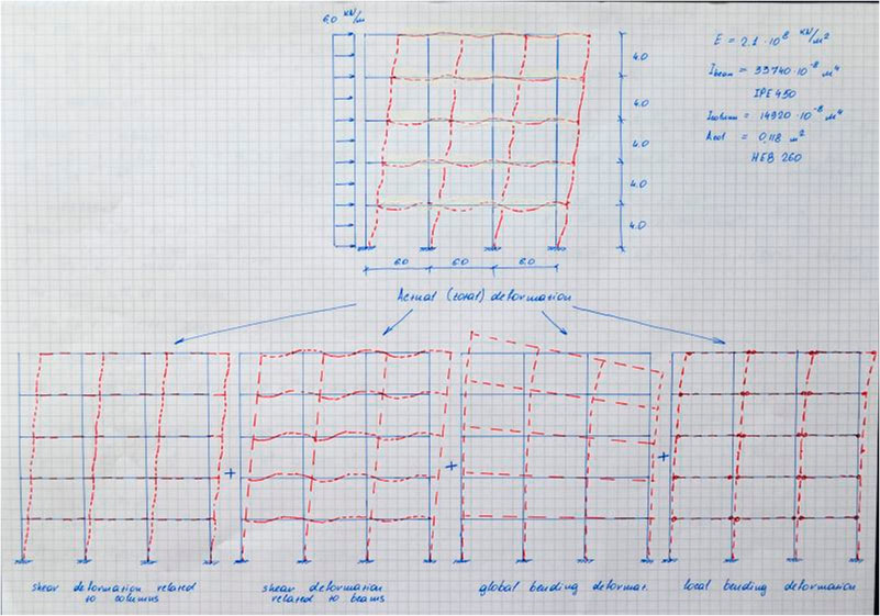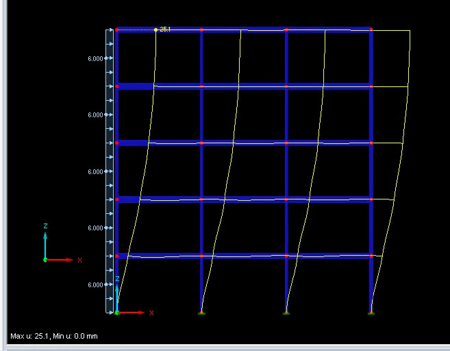 5-storey, 3-bays moment-resisting steel frame, carrying horizontal loads, checked for the deflection.