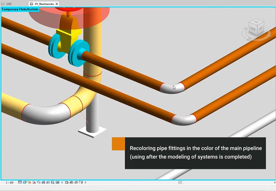“Revit. Coloring of connectors” – plugin for recoloring of pipe fittings in the color of the main pipeline. When painting pipe fittings during the modeling process, a lot of time is lost, to speed up the work, the process of painting fittings is automated after the modeling of systems is completed