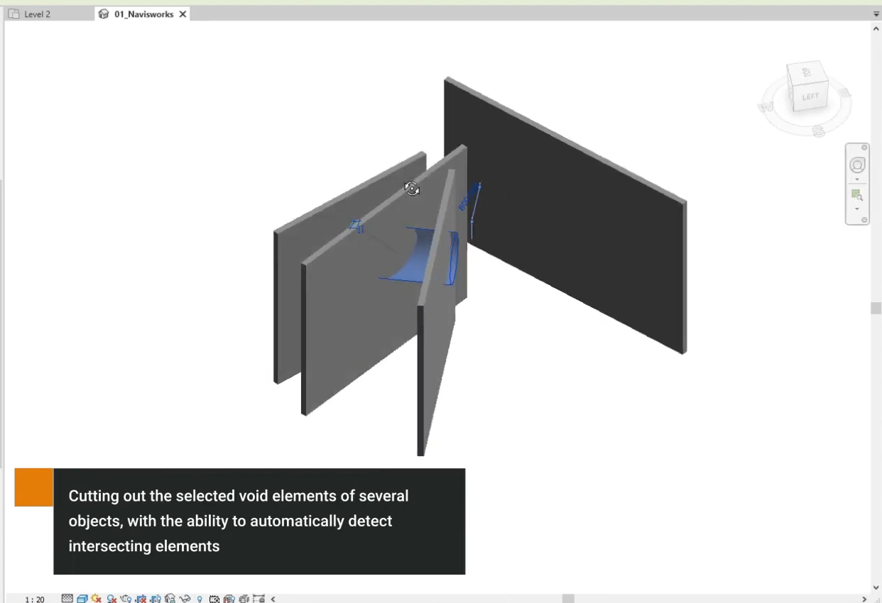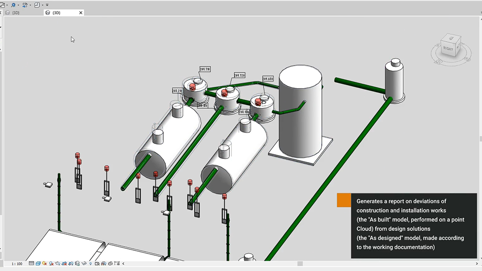 “Revit. Elements. Compare” – the plugin is designed to generate a report on deviations of construction and installation works (the “As built” model, performed on a point Cloud) from design solutions (the “As designed” model, made according to the working documentation). The plugin has visual comparison functions, the model in Revit is colored in four colors depending on the changes (green – new elements are added, orange – elements are changed, red – elements are removed, gray – there are no changes)