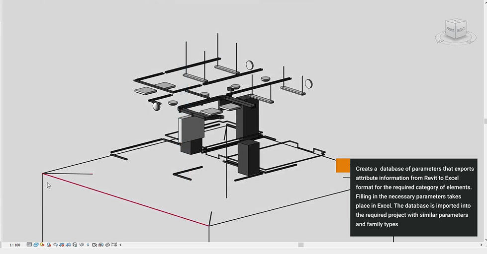 “Revit. Parameters. Database” – plugin allows you to creat a database of parameters that exports attribute information from Revit to Excel format for the required category of elements. Filling in the necessary parameters takes place in Excel, which reduces labor costs. The database is imported into the required project with similar parameters and family types. Additionally, the plugin is used to check the attributive content of the model