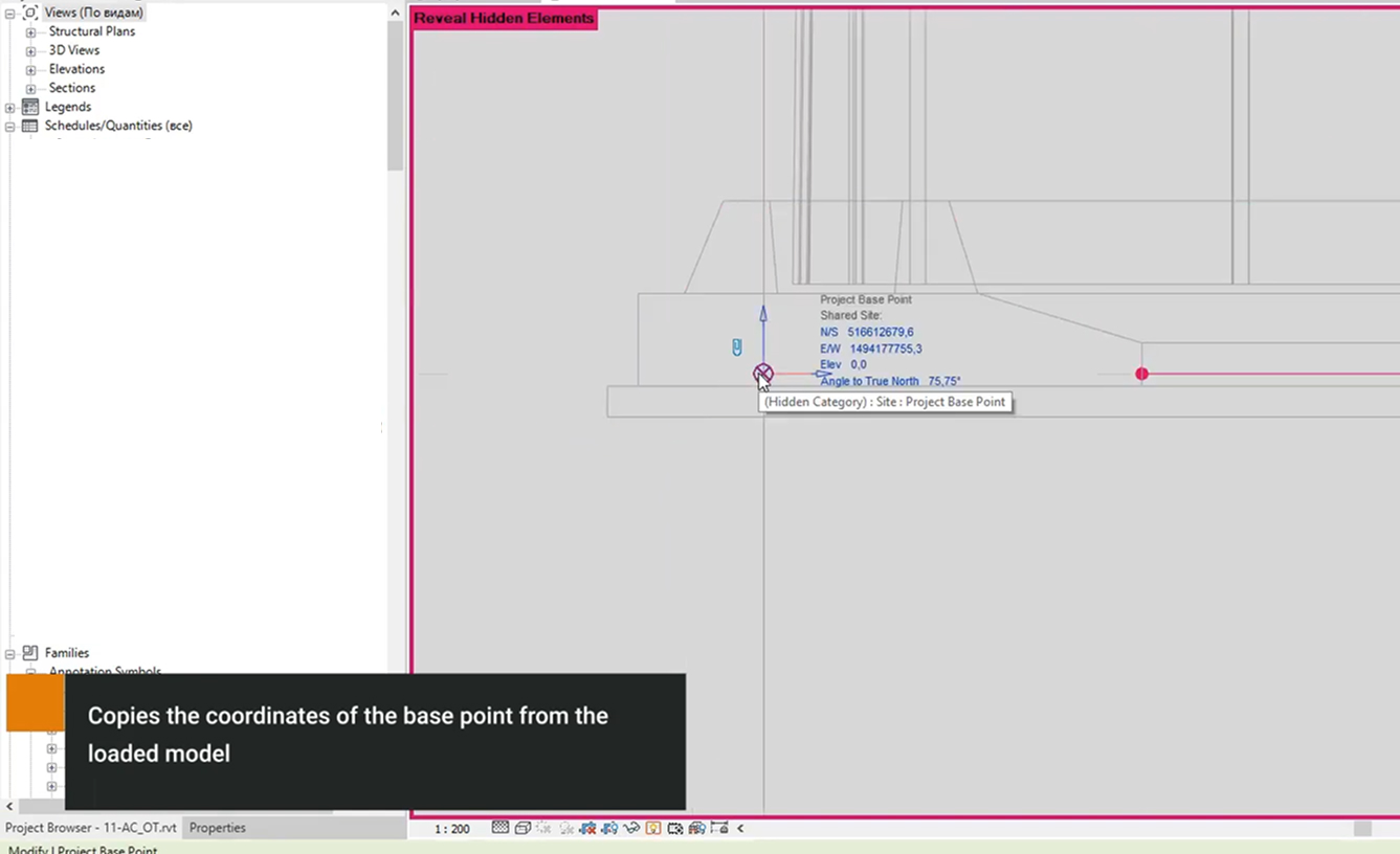 “Revit. Common. Publish coordinates” – to speed up the process of work in a project divided into models, depending on the object (building) and the documentation section, a plugin has been developed that copies the coordinates of the base point from the loaded model
